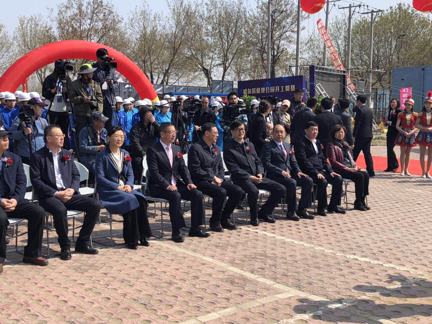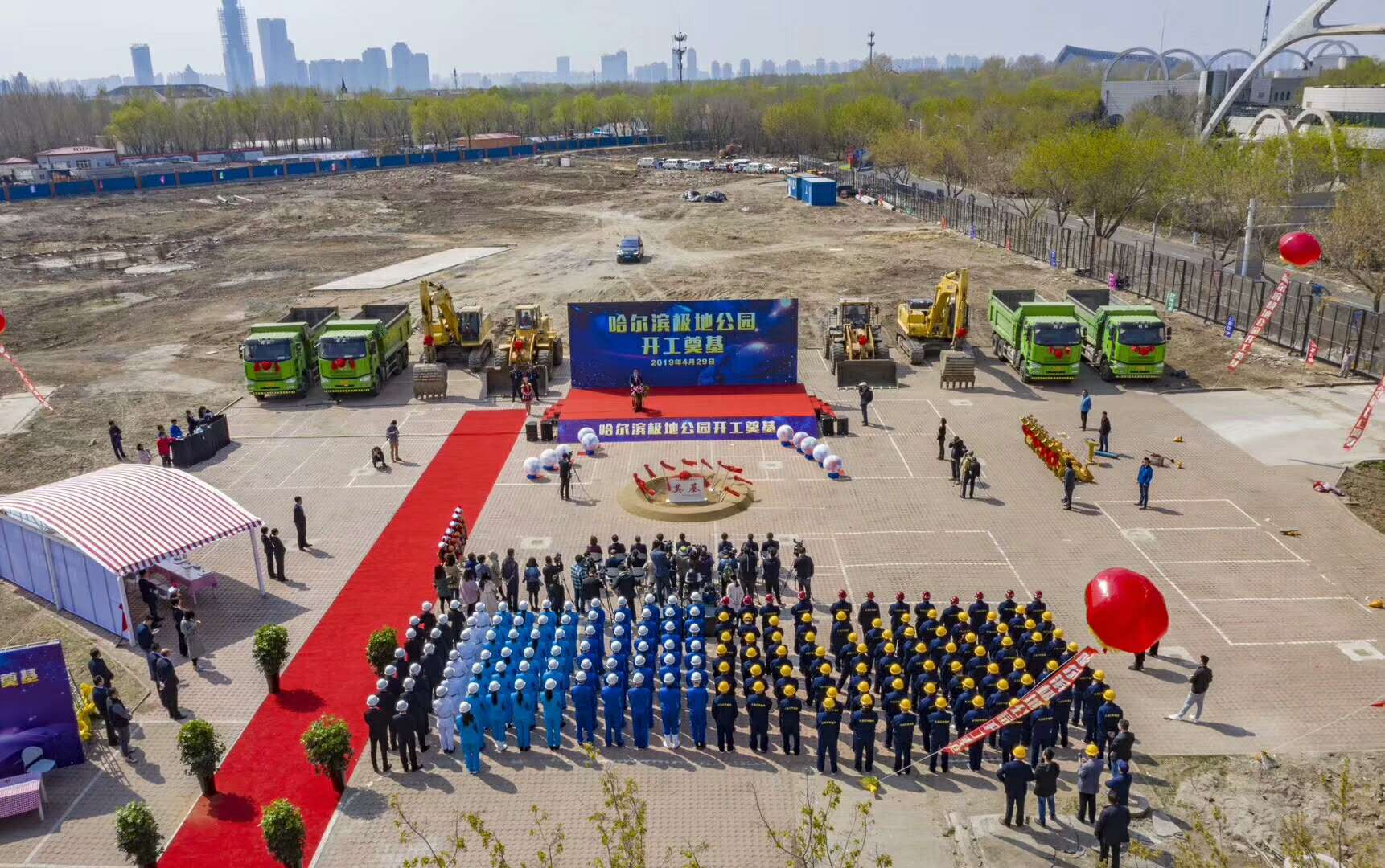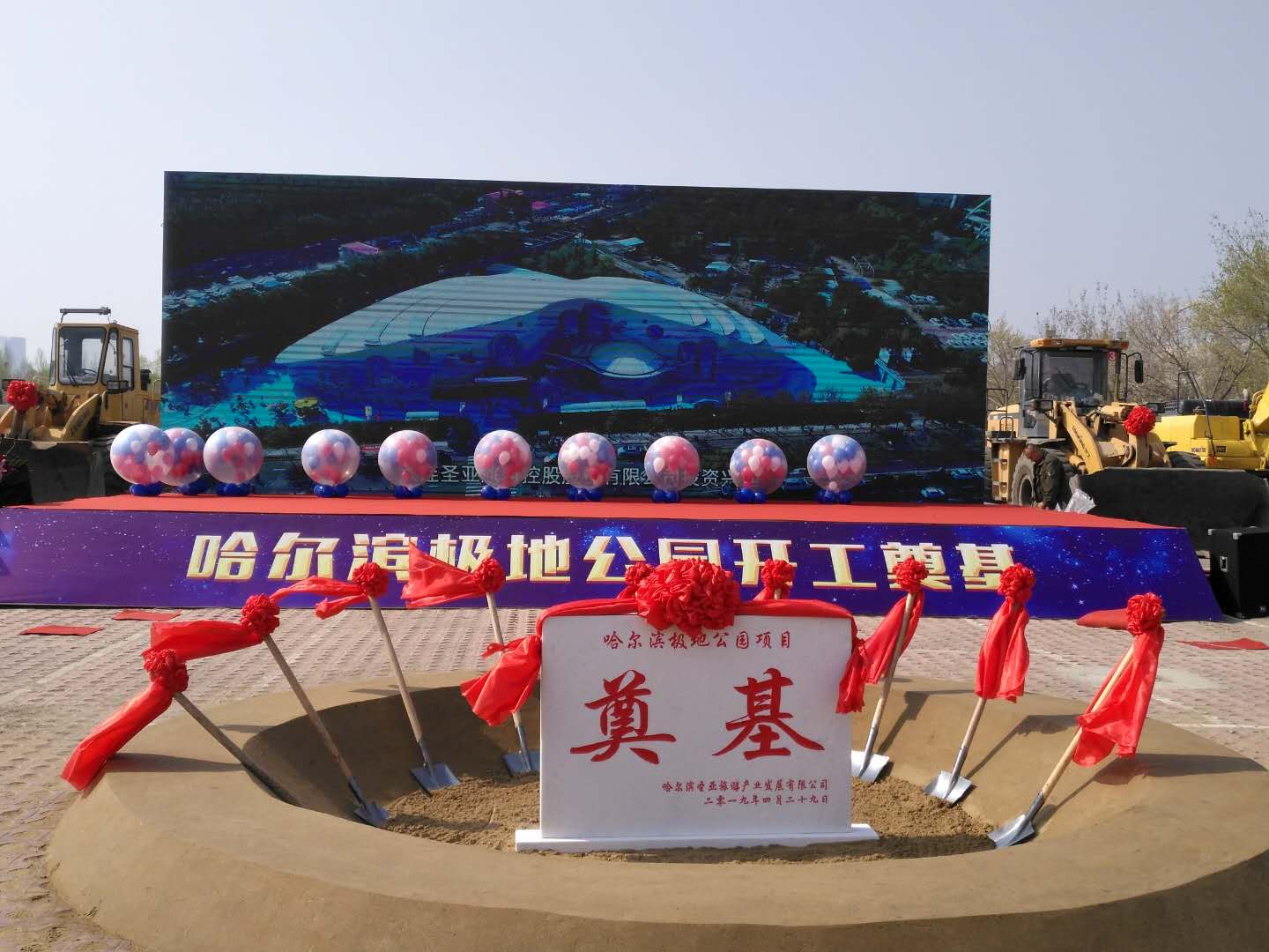 4月29日上午10时,彩旗飘舞,礼炮齐响,哈尔滨极地公园(极地馆二期)开工奠基仪式隆重举行。黑龙江省文化和旅游厅、哈尔滨市松北区人民政府、哈尔滨市文化广电和旅游局领导、大连圣亚旅游控股总裁为项目奠基启幕。我集团公司马华董事长应邀出席奠基仪式,并与来宾一道手持金锹,为项目培土奠基。集团东北公司极地公园项目部约100名员工统一着装,共同见证了奠基仪式。
