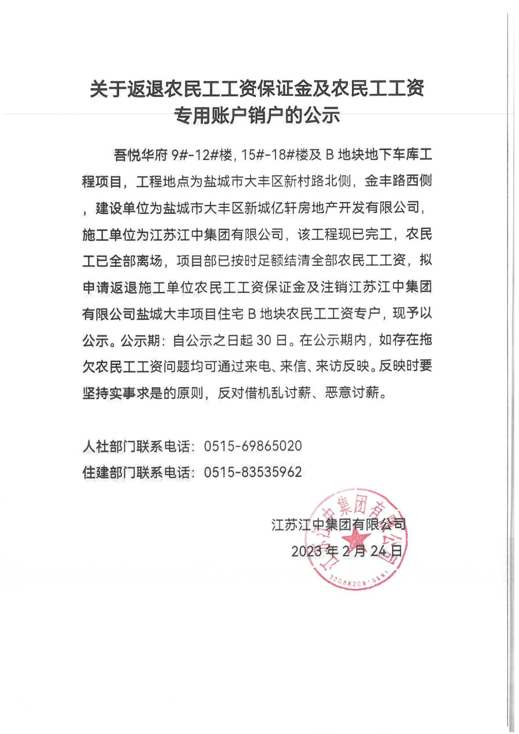 返退农民工工资保证金及农民工工资专用账户销户的公示